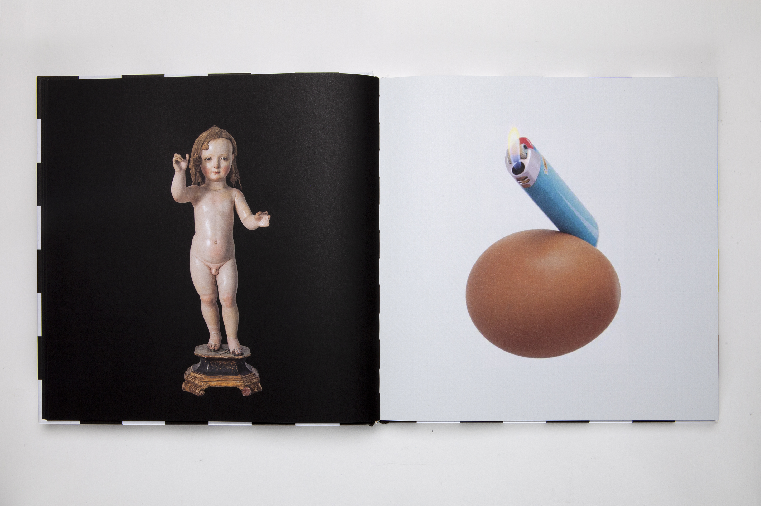The book’s square format pages alternates between black and a white, showcasing the proposed back-and-forth conversation. The middle section displays the works in the exhibition setting at the DESTE old slaughterhouse in Hydra.