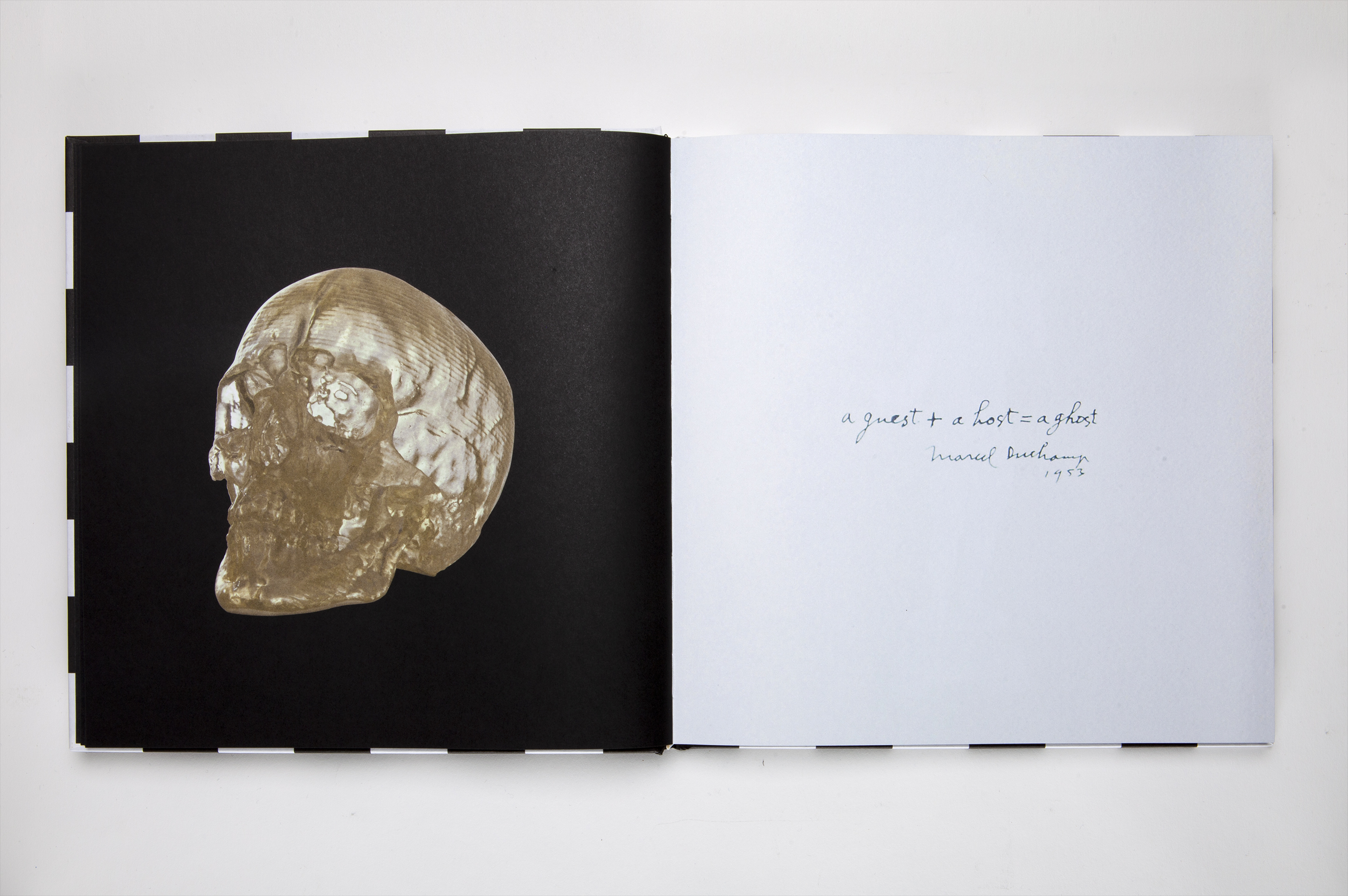 For the exhibition Ametria curator Roberto Cuoghi collected art pieces and artifacts from the Benaki Museum in Athens, and paired them together with pieces from the contemporary collection of Dakis Joannau of the DESTE Foundation, to create a radical exercise in the de-canonization of the curatorial method. The maze-like structure of the show enabled endless navigation paths, resulting in different experiences for each visitor. The installation was composed out of rigidly arranged rectangular black boxes, lit from their bottoms, and the objects were presented on or inside them, without titles or captions, creating an even more challenging and solitary experience. The catalogue follows the documentation of the exhibition and replicates the displays 1:1 two-dimensionally on its black pages. The book block is covered completely in deep black, except a hint of light from the bottom page edges. Each copy was carefully hand sprayed in an auto body shop.