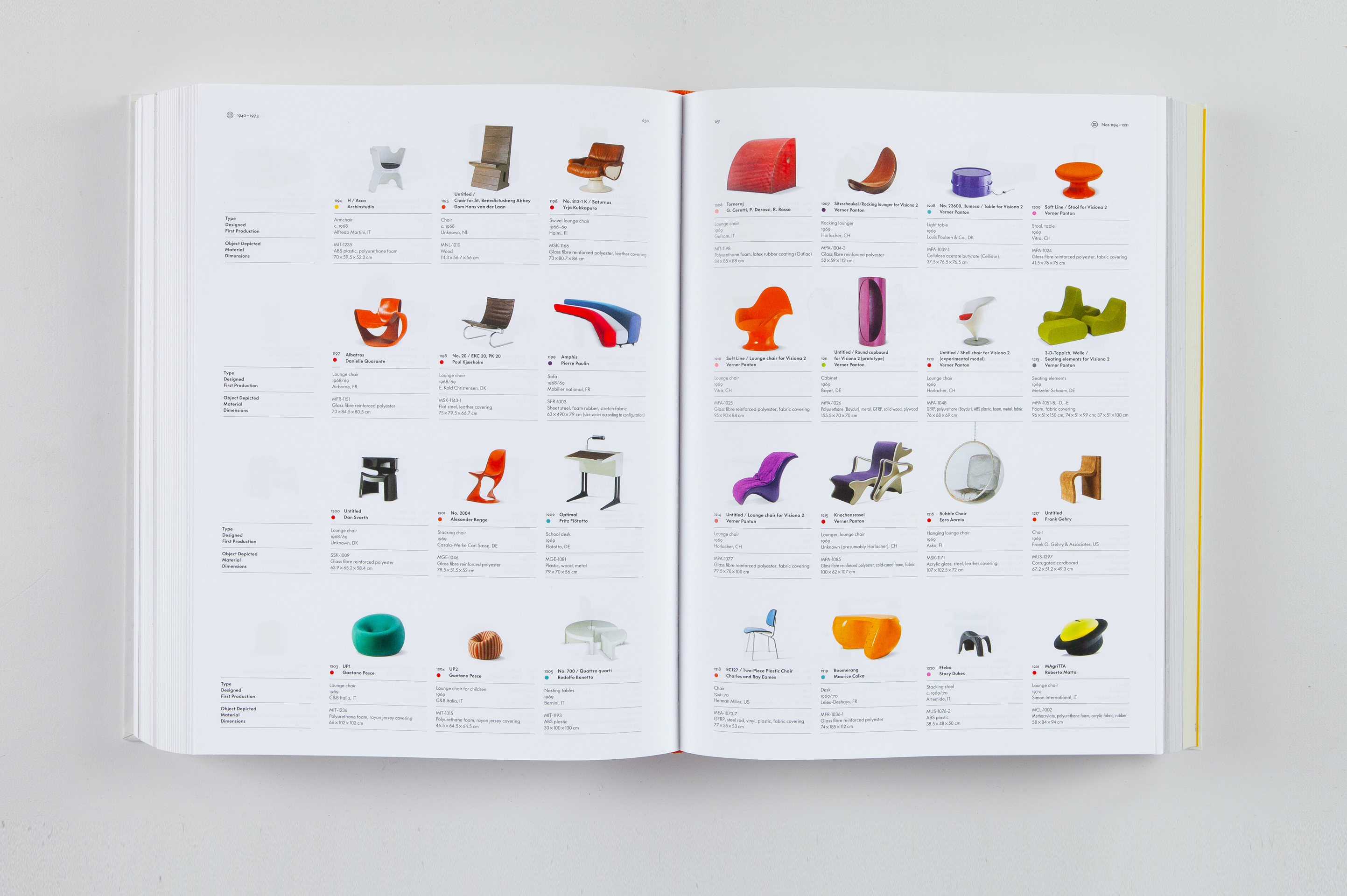The museum's immense furniture collection is the foundation for this book, which took over 20 years to research. This project required an intuitive way-finding system. The solution was a cross referencing system of color-coded dots and object numbers to allow the reader to easily navigate through the atlas. The colors represent the different typologies of furniture in the book.