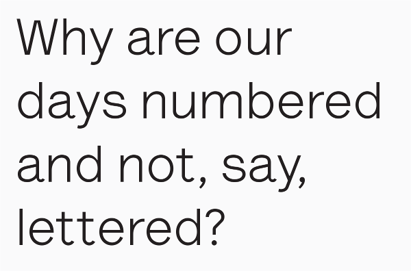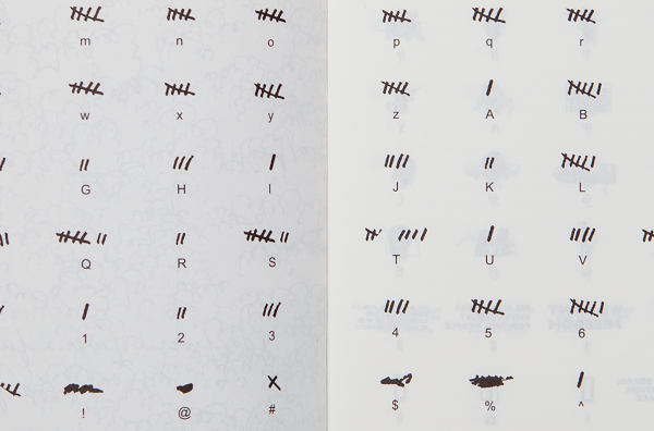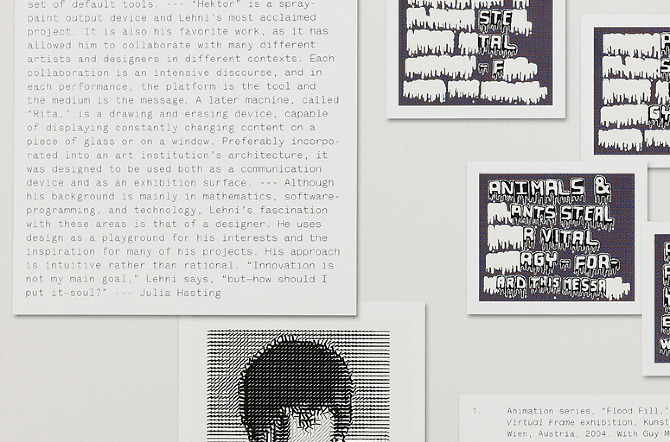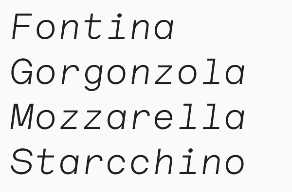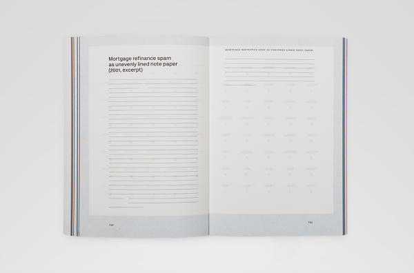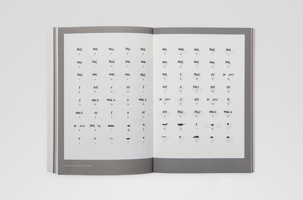 Area 2, and is used throughout the book exclusively. The font is based on a single weight basic specimen of a mid 70‘s typewriter font designed by Joseph Müller-Brockmann for Olivetti. Lettera is available as an Extended Latin OpenType format, including eastern European, Turkish, Baltic scripts, and alternate glyph. The specimen used for redrawing the first weight was a lo-resolution scan. When blown up large, it showed what appeared to be “reversed” ink-traps in critical joints of some glyphs. These elements that guided the design and later turned out to be a mistake caused by the poor quality of the document, remained. Lettera was later developed into a proportional version,