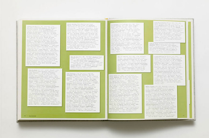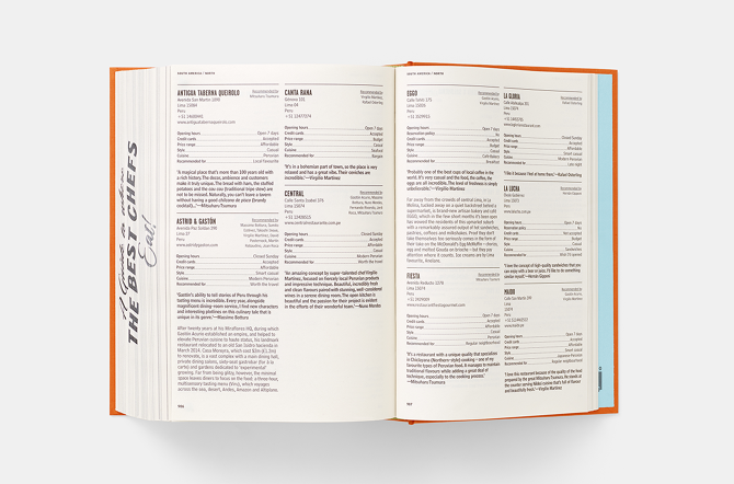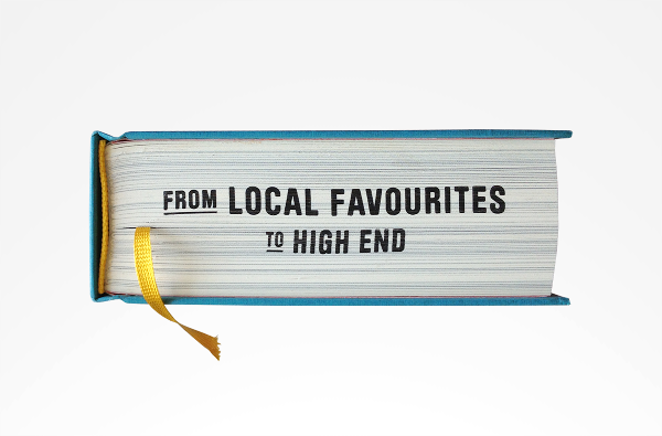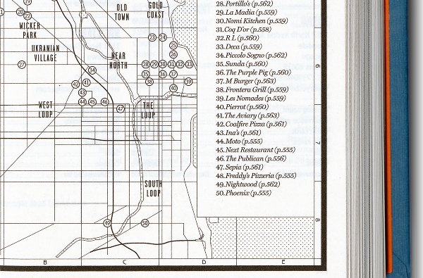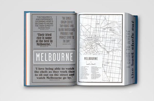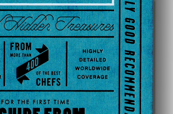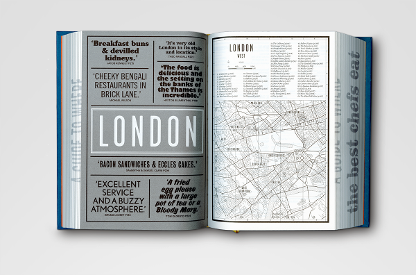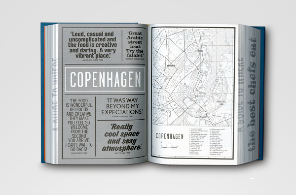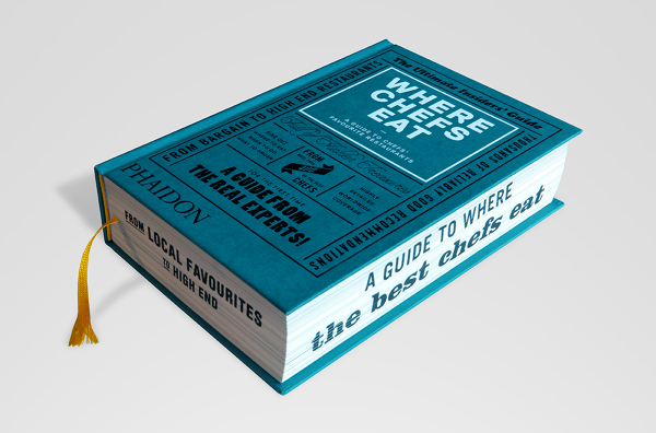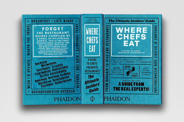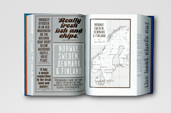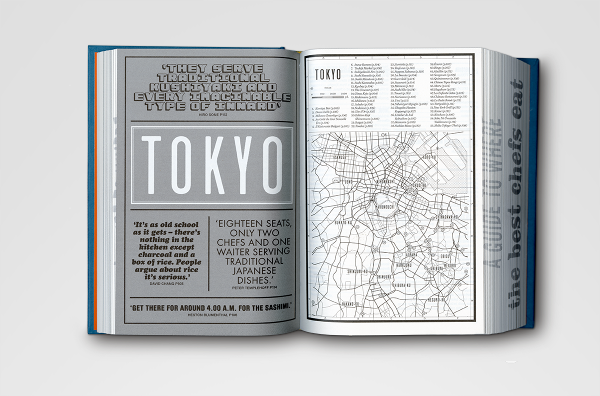 Where Chefs Eat: A Guide to Chefs Favourite Restaurants — A worldwide restaurant guide collecting recommendations from acclaimed international chefs. The mountainous volume of information in this lightweight bulky tome details about 2,300 restaurants around the world. The brief for the book came in a the form of a long list of sales blurbs, and the typographic solution was inspired by 1960's British phone books featuring ads on any possible real estate of the book - the front cover, spine, back cover, and paper edges. The entire book was printed with a single ink - Process Black, and all 704 pages are composed entirely out of typography and cartography. Over 50 different typefaces were used in this book, including a handful of custom made fonts.