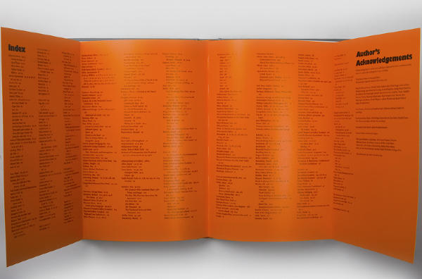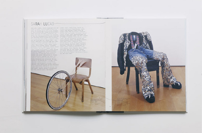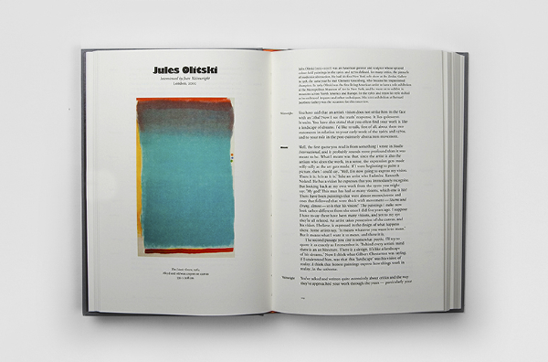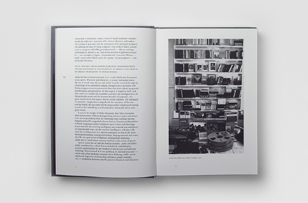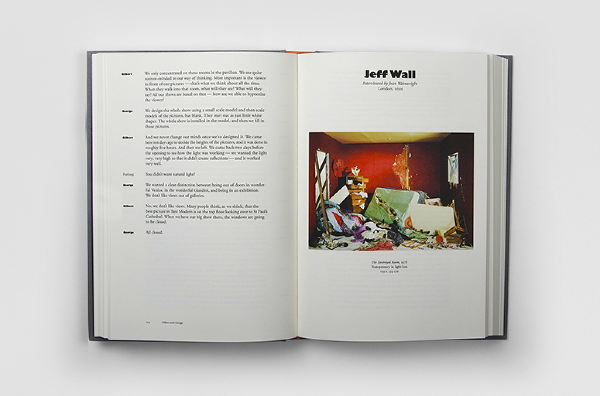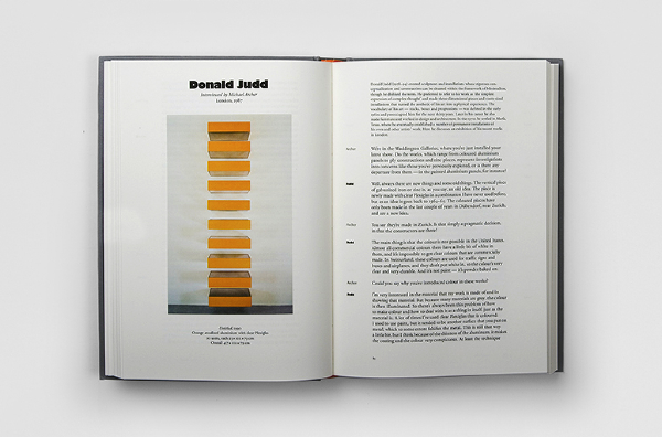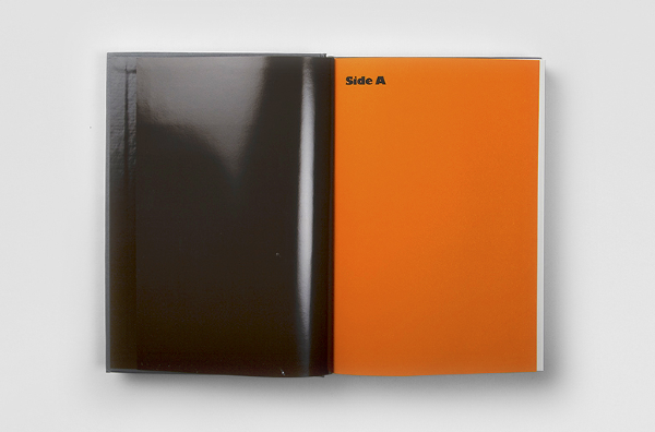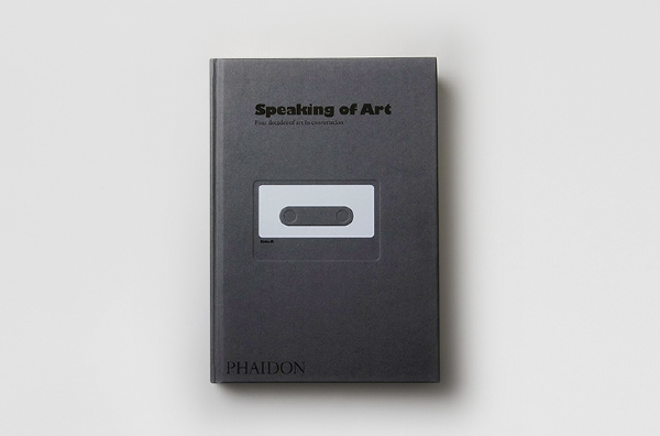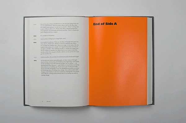 Speaking of Art — This book is a collection of transcribed interviews with contemporary artists compiled from a project called ‘Audio Arts’. The project, began in 1973 by WIlliam Furlong, was an audio magazine where each issue was sent to subscribers in a form of an audiocassette, and later (2003-2007) as a Compact Disk. The book is divided into "Side A" and "Side B" and the front and back cover are identical. After reading the first half of the book, the reader must flip the book to ‘Side B’ and read the rest starting from the back cover. The dark brown high gloss end-papers mimic the magnetic tape of the audiocassette.