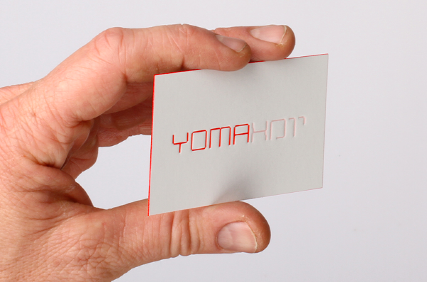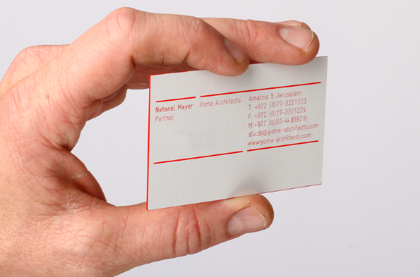 Yoma identity — Yoma is a Jerusalem-based architecture studio, with local, and international clients. The bilingual identity, in Hebrew and English, echos the architectural typology of a line, and line thickness. The logo is a monostroke custom typeface appears on all stationery items at 0.5mm thickness. The letter-pressed business cards are printed on a 0.5mm thick stock, with red gilded edges that three-dimensionally reflect the two-dimensional logo's line thickness.