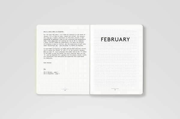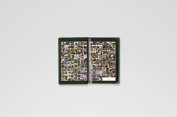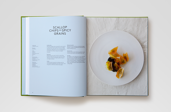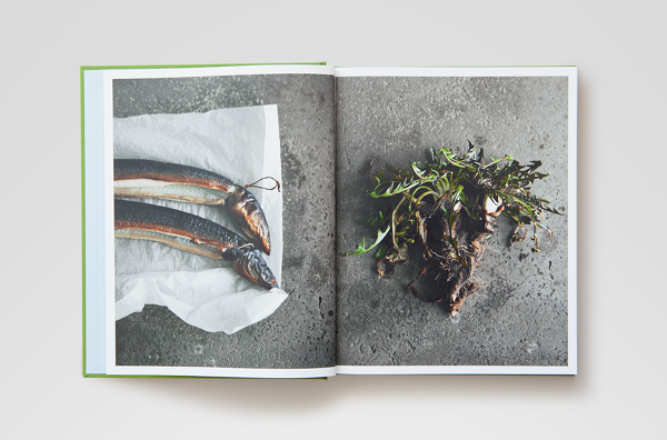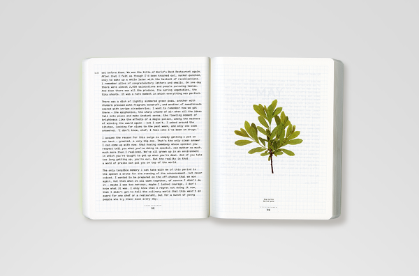 Noma. The materials for this book were a personal journal recounting the day-to-day life of chef René Redzepi and Noma, accompanied by hundreds of photos gathered from the restaurant's staff smartphones during the same period, and a collection of recipes that were developed that year. The design concept, following the narrative of 'collecting', suggested splitting the publication into three different printed matter: the journal — a soft bound notebook, containing only Redzepi's text, and flat-photographed plants, printed like 'pressed' flowers between the journal's pages; the recipes book — a classic, linen-covered hardback containing ingredient shots and food shots taken by photographer
